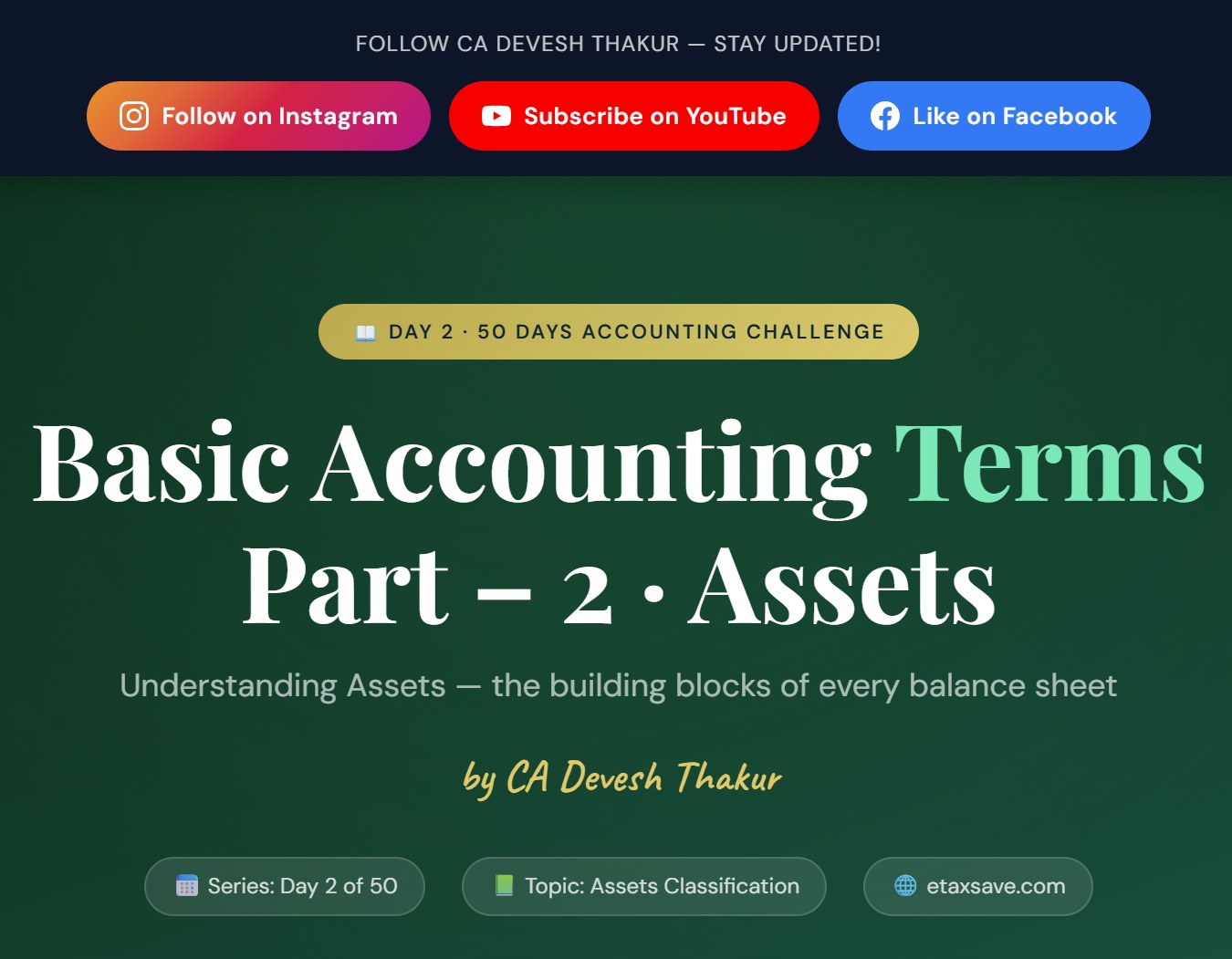 In Day 1, we covered the language of accounting — Entity, Capital, Liabilities and more. Today in Day 2, we go deeper into one of the most important concepts: Assets. Understanding what an asset is, and how to classify them, is essential for reading any Balance Sheet. Let’s break it all down simply! 💡
