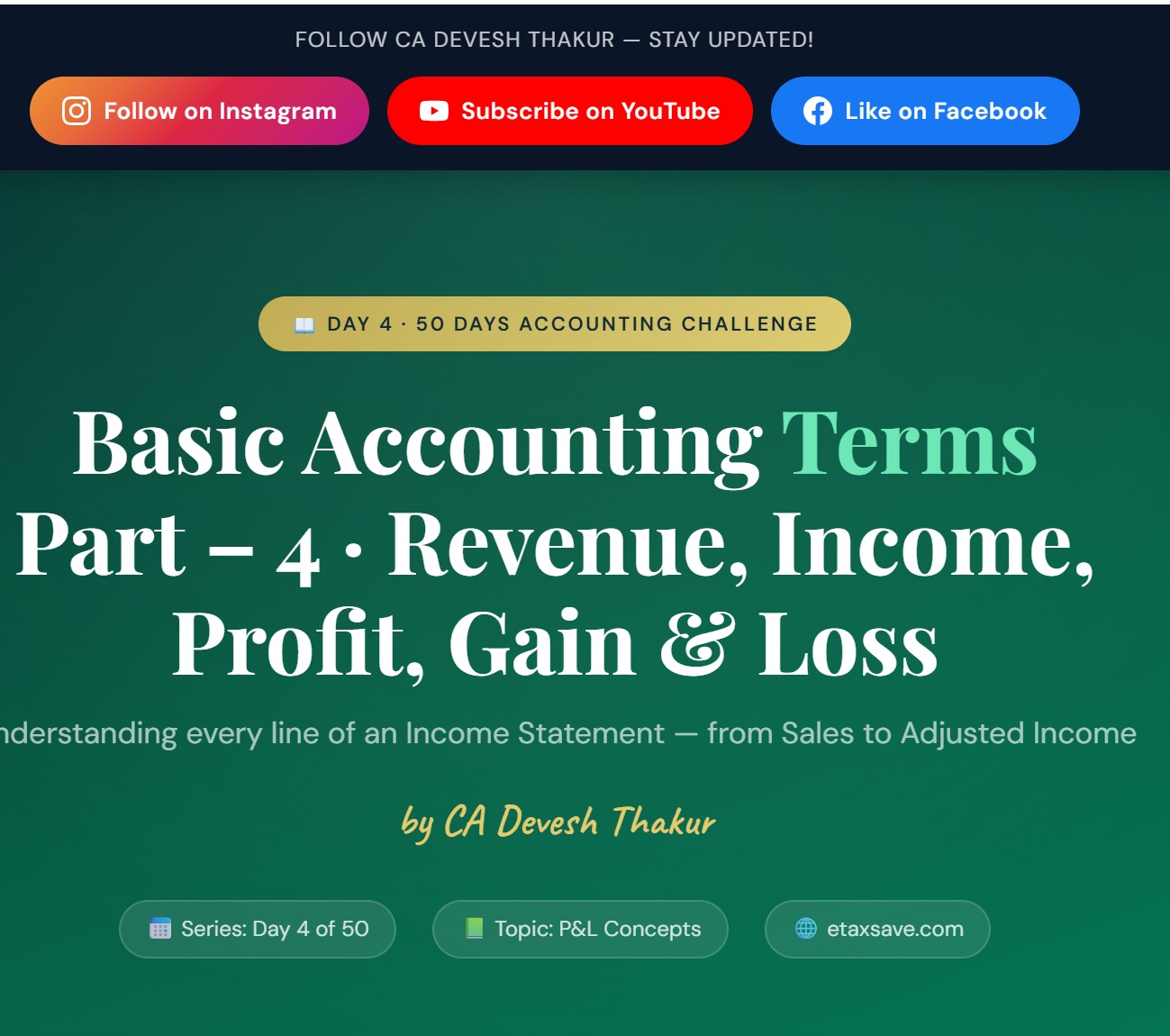 In Day 3 we mastered Receipts & Expenditure. Today in Day 4, we go through five closely related but distinctly different terms — Revenue, Income, Profit, Gain, and Loss — and see exactly how they flow through a real Income Statement with actual numbers. This is the heart of every P&L Account! 📊