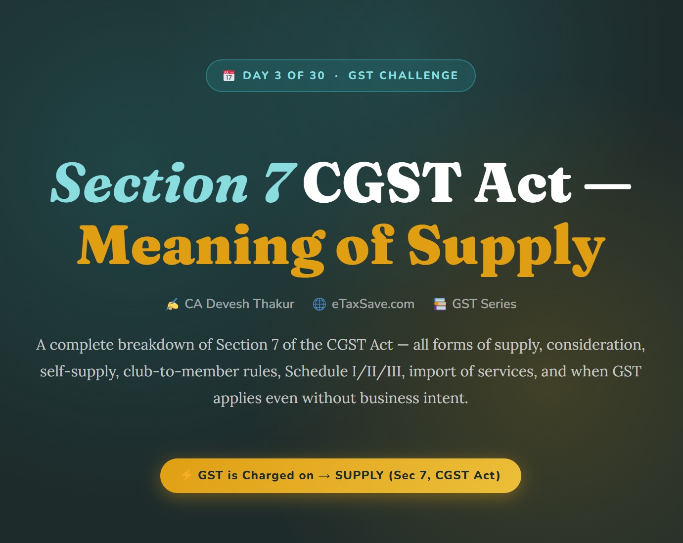 A complete breakdown of Section 7 of the CGST Act — all forms of supply, consideration, self-supply, club-to-member rules, Schedule I/II/III, import of services, and when GST applies even without business intent.