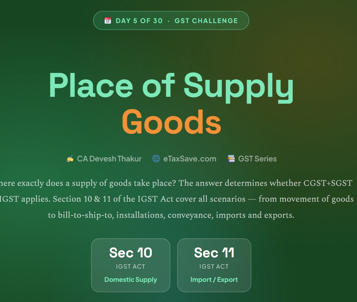 For goods, two sections of the IGST Act govern this — Section 10 for domestic supplies and Section 11 for imports and exports.